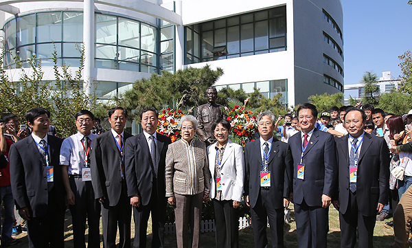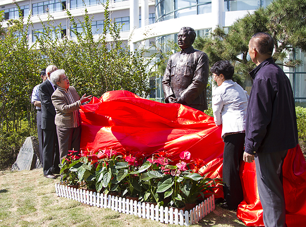 校友吴仪及校领导在杨光华塑像前合影 刘积舜摄影