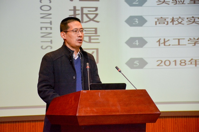 会上,化工学院副院长刘义从全国安全生产形势、实验室相关的法律法规及标准文件、高校实验室事故的统计分析及预防三个方面对安全工作进行分析,总结了学院实验室存在的安全培训缺失或不到位、废液随意倾倒、杂物占用消费通道等13条典型隐患,并对2018年实验室安全管理计划进行介绍,包括完善院系二级实验室规章制度、严格落实各项规章制度、通过网格化管理落实实验室安全主体责任、建立实验室安全检查机制等8项重点工作。