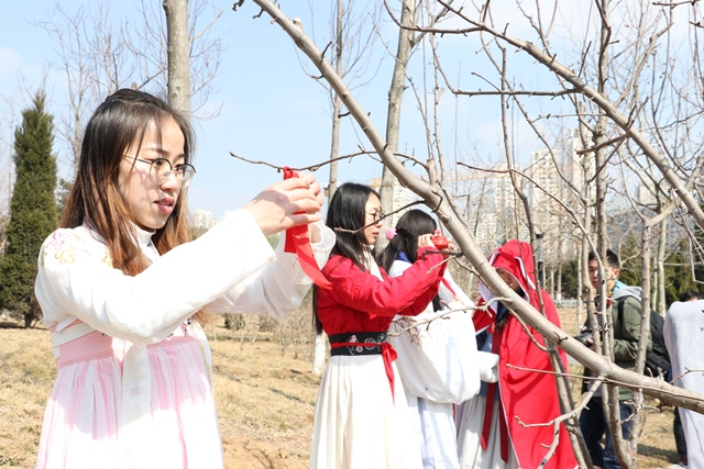 3月8日,学院与储运与建筑工程学院联袂举办“诗茵·雅歆”古装游园会,弘扬传统文化的翰墨飘香、汉诗歌咏、投壶毛健、踏青赏红四部分吸引了众多女生参与。翰墨飘香书法社成员挥毫泼墨,书写下自己的理想抱负和祝福话语;身着汉服的女学生吹笛作赋,尽展汉代风韵,深情朗诵,带领现场学生领会诗韵之妙;学生重现古代士大夫宴饮时所进行的“投壶毛健”游戏,主客轮流投壶,将游园会推向高潮;学生们结伴踏青,在红绸丝带上写下祝词祈愿,系在枝头完成“赏红”,表达对花神的敬畏和对未来美好的祝愿。