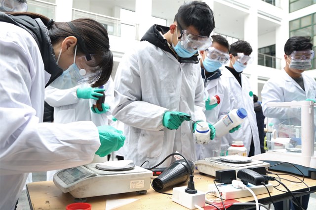 参赛队伍正在为小车制作化学能源电池 杨晓莹摄影
