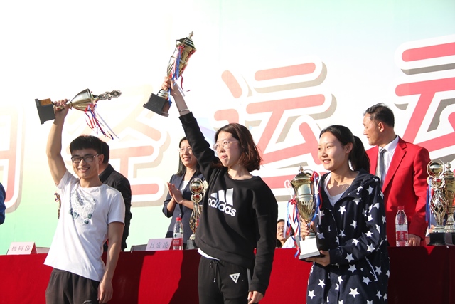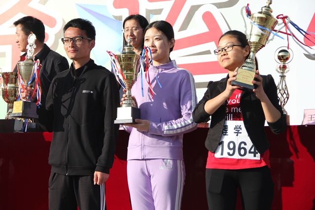 全运同学代表学院领学生甲组女子团体第一名奖杯(中间)