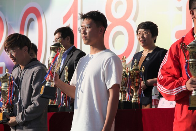 葛毅凯同学代表学院领学生甲组男子团体第二名奖杯(中间)