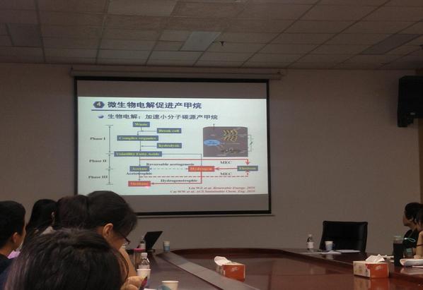 刘文宗博士向师生们展示了废弃生物质生物转化与资源化的最新研究进展,并详细介绍了土壤/水中有机污染物原位微生物电修复技术、微生物电合成化合物技术、基于电化学和传统发酵工艺的微生物电发酵技术、微生物催化电解加速产氢技术、微生物电解促进产甲烷工艺等。刘文宗博士展示了微生物电化学美好的发展前景,鼓励学生们积极投身该领域研究,推动生物质能转化技术的进步。