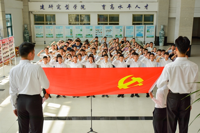 在《国际歌》雄浑庄严的旋律结束后,教师党员为所有新党员佩戴党徽。然后,在学院团委副书记、辅导员孔德辉的领誓下,全体新党员面朝党旗庄严宣誓,现场老党员也郑重举起右手重温入党誓词。