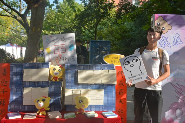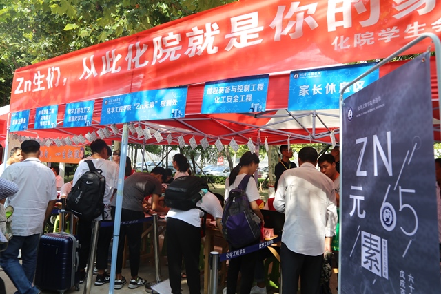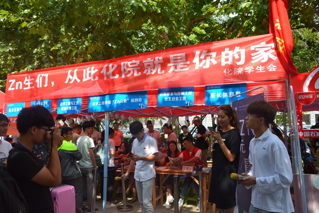 2018年恰逢学校65周年庆,学院用书籍摆出“65”的字样,营造书香氛围;“喜迎千禧少年,传承薪火化蕴”的对联表达了对新生的期望。优秀校友墙吸引了众多家长与新生驻足观看,通过优秀典型激励新生发奋图强,创造美好未来。学院还在迎新点设立了家长休息区,为家长答疑解惑,让其体会到学院的贴心。另外,学院迎新点突出“我在化院有个家”主题,设立迎新主题海报和主题合影墙,欢迎“Zn”元素来到化院这个大家庭,聚力化院,接续奋斗。