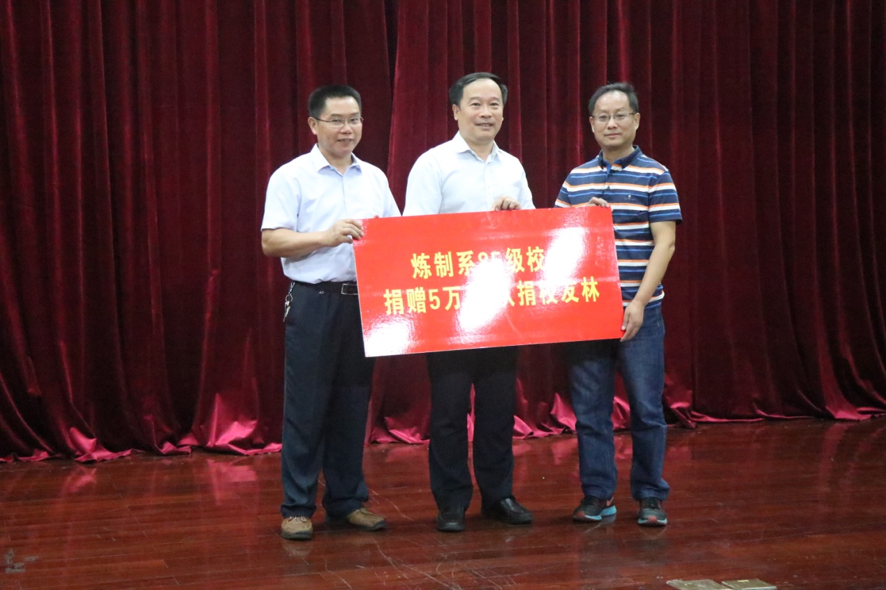姚军代表学校接受炼制系85级校友的捐赠,并为校友颁发了捐赠证书。炼制系85级校友感恩母校,向母校捐赠5万元认捐校友林。校友们十分重视校友林的认捐,在校园里精心选取一片树林,并特别设计了校友林的立牌。
