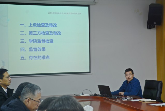 会上,学院安全环保监管办公室副主任戴永胜从上级检查及整改、第三方检查及整改、学院监督检查以及监督效果四个方面汇报了2019年度实验室安全检查及整改情况,重点查摆了目前存在的主要问题和安全隐患。副院长刘义从实验室安全现状、2019年实验室安全管理工作情况以及实验室安全检查情况三方面对学院实验室安全管理工作进行汇报,并要求各系室、中心利用寒假对各实验室可能存在的问题进行全面整改。同时,刘义着重部署了2020年要开展的重点工作,一是全力营造浓厚的实验室安全文化氛围,加强学生管理和安全培训;二是加大硬件投入,提升本质安全能力;三是控总量、建台账、规范存用,严格化学品管理;四是承办中国化工教育协会化工实验室安全管理培训班;五是力争举行危险化学品应急处置演练。