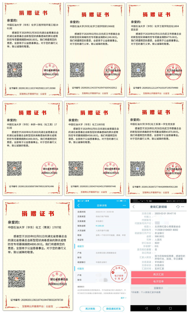 疫情发生以来,多个党支部募集“特殊党费”、多个班级捐出先进集体奖学金、班费等,师生纷纷捐款捐物,为抗击疫情贡献爱心和力量。化院研1909班募集1240元、本研一体化(化工类)1701班募集1000元、应化1804团支部募集团费770元、化工(菁英)1707班捐出班费800元、化工1805班捐出班费500元、环境1901班募集600元,刘家铭、唐嘉婧等百余名师生将10元至1000元不等的奖学金、压岁钱捐出,通过湖北省慈善总会、韩红爱心慈善基金会、微公益等平台将爱心传递到了武汉,部分师生收到了来自募捐平台的“捐赠证书”和诚挚的谢意。其中,蒲公英党员先锋队在全院研究生中发起“武汉加油”爱心捐款活动,共募集善款21879.71元,将通过武汉大学教育发展基金会驰援武汉。先锋队在公开信中对同学们表示诚挚感谢,并表示将一直跟进募捐款的流向,尽最大努力将同学们的爱心送到武汉最有需要的地方。化工系第一学生党支部捐出党费1870.80元,其党支部书记表示,听闻疫情防控工作需要大量购置医疗及防护物资,支委成员线上开会商议讨论,组织支部党员为疫区同胞捐款捐物,在特殊时期募集“特殊党费”,为打赢这场肺炎疫情防控战献出自己的一份力量!
