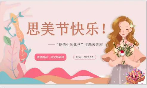 与女神相约,科学防疫。2018级邀请应用化学系副教授吴文婷老师为同学们作了“疫情中的化学”主题云讲座。吴文婷从疫情防控中大家关切的消毒、口罩、药物等几个方面展开,讲述了其中的化学知识、作用机理等,让同学们通过讲座对如何科学防疫有了更加深入的了解,从而更好地做好个人防护。“科技,就是打赢防疫战的底气!大家众志成城,坚信定会取得这场战役的全面胜利。”吴文婷在讲座最后这样谈道。