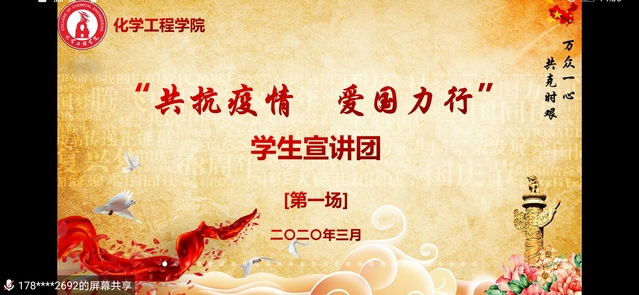 接着,化研1805班硕士研究生、化工研究生第二党支部书记杜康通过讲述自己在湖北省咸宁市通城县和平社区担任志愿者的20天中,负责宣传疫情防控、入户排查登记居民信息、打扫社区卫生、发放物资、为社区居民购买生活必需品等相关工作的“酸甜苦辣”,向同学们全面展示了一个湖北疫区志愿者的“日常”和不易。杜康讲道:“在这场抗击疫情的攻坚战里,我们作为党员就是一个战士,只要我们坚定信心就一定能打赢这场战争,正道中国,中国必胜!”