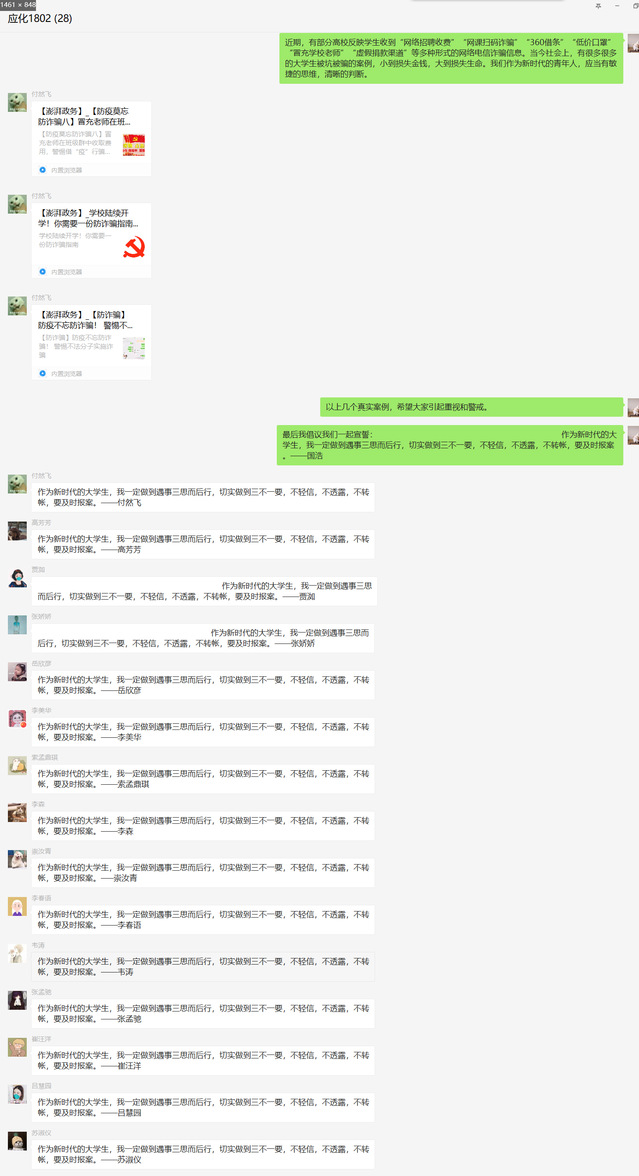 各班通过不同的形式向学生传播预防网络电信诈骗知识,加强宣传教育,提高学生安全防范意识。应化1804班和化工1805班通过举办防诈骗小课堂的方式,通过模拟对话、视频学习的方式再现诈骗过程,展示了常见诈骗方式,调动了学生们的积极性,有效提高学生预防和应对网络电信诈骗的能力;化工1803班通过分享生活中经历过的真实案例,学生共同探讨,有助于在日常生活中提高警觉,增强防骗识骗能力;化工1802班通过制作问卷,开展网络诈骗教育问答的形式,查漏补缺,从而更好地掌握防骗识骗安全知识。应化1802班在活动最后共同作出承诺,遇事三思而后行,切实做到“三不一要”。正如应化1804班团支书李晓瑜在会上所说:“天下没有免费的午餐,也没有白掉的馅饼。我们在日常生活和学习中,不要轻信陌生电话、手机短信和电子邮件,一旦遇到涉及安全问题的电话,应及时和学校或派出所取得联系,确保生命财产安全,提高警惕,加强防范意识,防止受骗。”