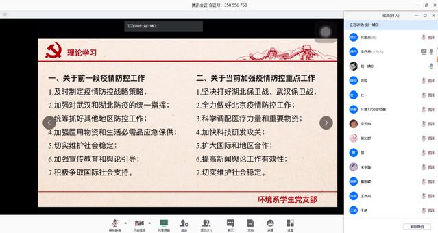 为深入贯彻落实习近平总书记关于坚决打赢疫情防控阻击战的重要指示精神,落实学校、学院党委的各项决策部署,充分发挥学生党支部的战斗堡垒作用和学生党员的先锋模范作用,3月20日,化工学院环境系学生党支部积极响应学生党总支号召,组织开展了以“战疫情抓发展,守初心担使命”为主题的线上组织生活会。