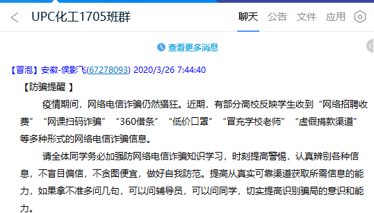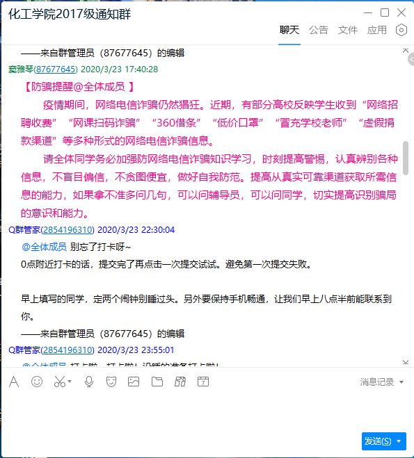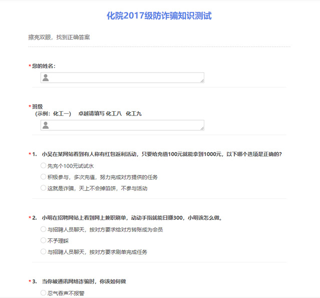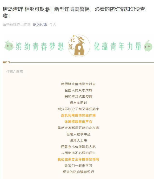 学院以预防网络电信诈骗安全教育为重点,结合疫情期间新型诈骗案例,通过QQ群、微信公众号等平台推送预防网络电信诈骗知识,加强宣传教育,提高学生安全防范意识。辅导员和班主任在年级内积极开展以“预防网络电信诈骗,提高安全防范意识”为主题的安全教育,共同做好学生的教育提醒工作,教育学生在日常生活中提高警觉,增强防骗识骗能力。学院积极组织各班级开展安全主题教育班会,通过分享个人受骗经历、观看防诈骗视频、开展防疫网络诈骗教育问答等方式,大力宣传防骗识骗安全知识,有效提高学生预防和应对网络电信诈骗的能力。