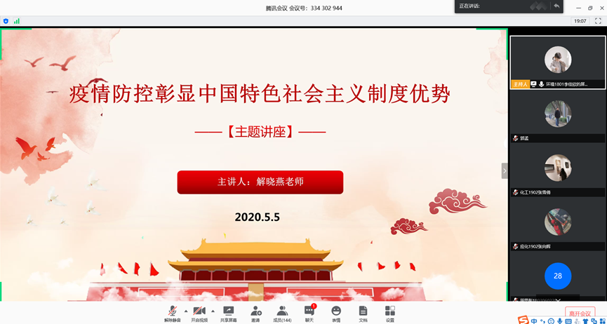 为引导广大团员青年坚定“四个自信”,深刻理解“全球抗疫中的中国担当”,增强打赢疫情防控阻击战的决心和勇气,5月5日晚,化学工程学院通过腾讯会议举办了《疫情防控彰显中国特色社会主义制度优势》专题讲座。本次讲座由马克思主义学院解晓燕老师主讲,学院团委书记郭孟以及240余名学生参加了此次讲座。