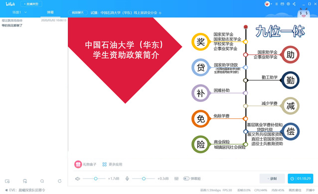 活动开始前,高昶通过直播平台播放了石大招生宣传片,并通过QQ群向学弟学妹们推发了自制的电子版《太阳成集团tyc33455cc2020年学生资助宣传手册》,详细介绍了国家资助政策实施的目的和形式,包括国家助学金、各类奖学金、国家助学贷款在内的十三项主要资助政策以及申请方法,重点讲解了石大“奖、助、贷、勤、补、减、免、偿、险”九位一体的学生资助体系。他还结合自身经历,将各项资助政策与衣、食、住、行等方面有机结合起来,指导学生在大学期间如何获得国家资助。高昶还介绍了石大的地理位置与环境概况、丰富多彩的文化生活以及良好的发展前景,分享了理科实验班和本研一体化班等多种培养模式,让学弟学妹们从各个角度了解石大。在分享高考经验时,高昶结合近年招生情况分析了报考石大的成绩要求,鼓励学弟学妹们克服今年特殊情况,调整心态、积蓄力量、全力冲刺。最后的提问环节,高昶耐心解答学生的疑惑,双方还就关心的热点、难点问题进行了深入热烈地讨论。