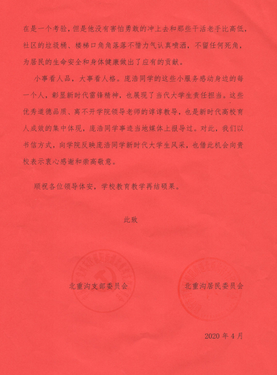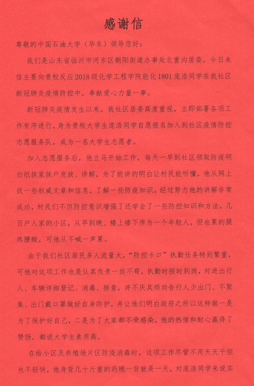 近日,学院收到一封来自山东省临沂市河东区朝阳街道办事处北重沟居民委员会的感谢信,信中对能化1801班学生庞浩积极参与社区防疫工作给予了充分的肯定,也表达了对学校、学院育人工作的衷心感谢与崇高敬意。