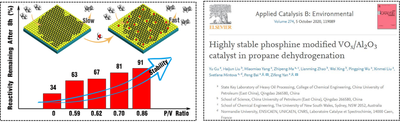 题为《高稳定性磷化氢改性的VOx/Al2O3丙烷脱氢催化剂》(Highly stable phosphine modified VOx/Al2O3catalyst in propane dehydrogenation)的论文发表在Applied Catalysis B: Environmental上。我校博士生顾宇为第一作者,白鹏副教授和阎子峰教授为论文通讯作者。该项工作得到国家自然科学基金、国家重点研发计划专项、中央高校基本科研基金、山东省自然科学基金以及重质油国家重点实验室基金等项目的资助与支持。