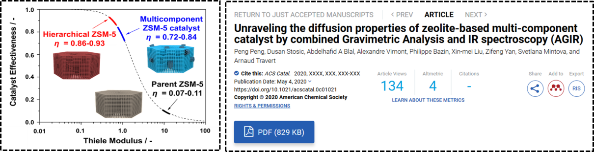 题为《利用重力-原位红外光谱联用技术(AGIR)研究沸石基多组元催化剂的扩散性能》(Unraveling the Diffusion Properties of Zeolite-Based Multicomponent Catalyst by Combined Gravimetric Analysis and IR spectroscopy (AGIR))的论文发表在ACS Catalysis上,并被推荐为封面文章。我校博士生彭鹏为第一作者。我校阎子峰教授和法国国家科学研究中心Arnaud Travert教授为共同通讯作者。该项研究得到国家留学基金委、王宽诚教育基金会、中法分子筛联合实验室、国家重点研发计划、山东省重点研发计划与中国石油炼油催化剂重大专项等基金的资助与支持。