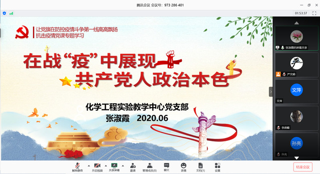为庆祝建党99周年和继续推进“不忘初心、牢记使命”主题教育,认真贯彻习近平总书记重要讲话和党中央决策部署,6.24日晚,实验教学中心党支部开展了“让党旗在防控疫情斗争第一线高高飘扬,抗击疫情党课专题学习”,会议由支部书记张淑霞主持。