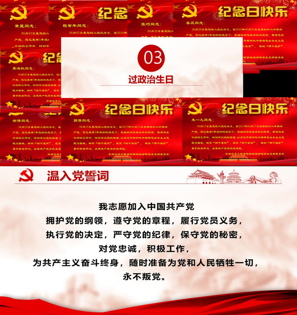 8名过“政治生日”的党员对支部的关怀和祝福表示感谢,并回顾成长历程,畅谈感想体会。一致认为通过“政治生日”,唤起当时入党的初心,今后将始终铭记党员身份,牢记党员使命,践行党员义务,永葆共产党员政治本色,坚定理想信念,不断增强“四个意识”,坚定“四个自信”,做到“两个维护”,用实行动践行诠释党员形象。最后,持续了两个多小时党日活动,在庄严肃穆的重温入党誓词的仪式中落下帷幕。