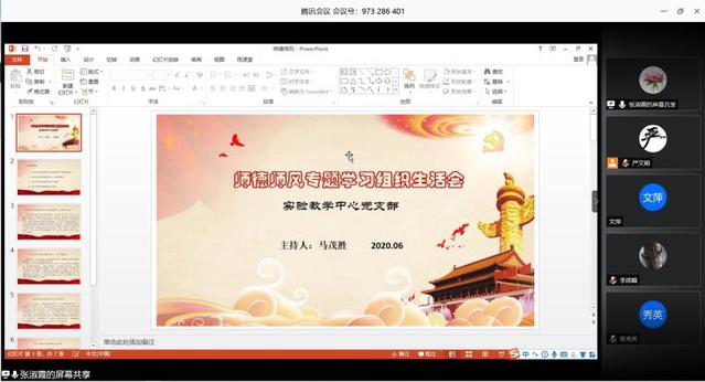 为深入推进实施《中共中央国务院关于全面深化新时代教师队伍建设改革的意见》,全面提升教师思想政治素质和职业道德水平,按照学院党委安排,6.24日晚,实验中心党支部组织中心全体教师进行“做新时代合格的教师”的线上集体讨论学习,会议由支部成员马茂胜主持。