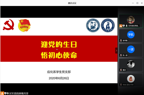 建党99周年来临之际,为回顾党的光辉历程,讴歌党的丰功伟绩,应化系学生党支部开展“迎党的生日 悟初心使命”系列线上组织生活。