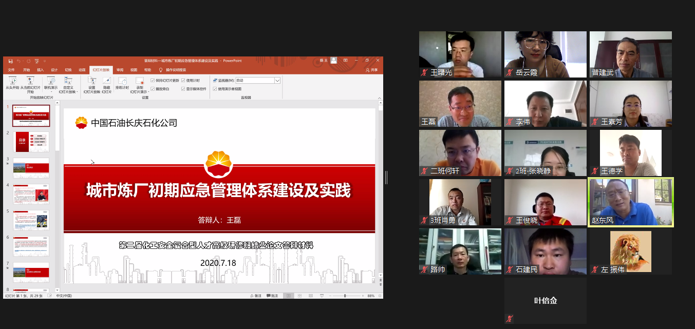 本次共有来自政府应急管理系统,中石油、中石化、中海油、中国化工、中化集团、万华化学等各大企业、设计院和咨询机构的48名学员参加首批答辩。前期论文指导过程采取企业和高校双导师制,将理论与实践相结合,从基本概念的夯实、基础理论的构建、到系统专业的学习,强化了学员的化工安全意识,使其现有工作经验相结合,针对某一课题展开深入研究,实现发现问题、分析问题和解决问题的能力培养。