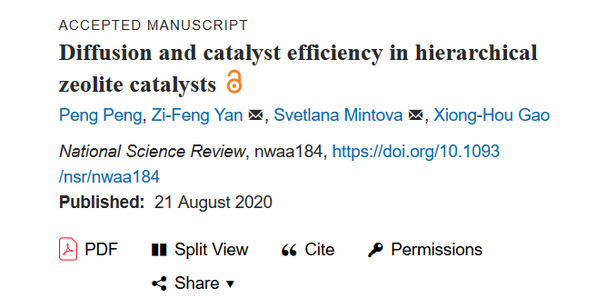 近日,《国家科学评论》(National Science Review,NSR)刊发了我校化学工程学院阎子峰教授催化材料团队在沸石催化剂工业化应用方面,题为《多级孔沸石催化剂的扩散与催化效率》(Diffusion and catalyst efficiency in hierarchical zeolite catalysts)的最新综述文章。论文第一作者为我校化学工程学院毕业博士研究生彭鹏,化学工程学院阎子峰、敏托娃教授为共同通讯作者,太阳成集团tyc33455cc为第一通讯单位。