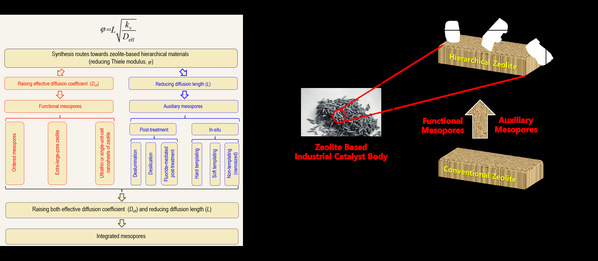 针对上述问题,我校阎子峰教授与敏托娃教授团队,从催化反应工程角度讨论了如何通过多级孔结构的设计提高沸石的扩散性能与催化效率:他们根据催化效率提升的主要原因,将引入的沸石介孔结构划分为“功能型介孔”(functional mesopore)、“辅助型介孔”(auxiliary mesopore)和“综合型介孔”(integrated mesopore)三大类,并分别对其制备工艺、孔道结构表征技术和催化反应性能进行了评述。