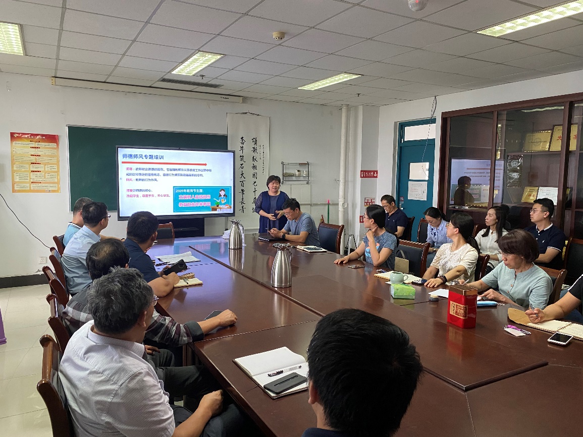 会上,丁传芹首先说明了此次专题活动的背景和意义。然后,以2020年教师节主题“立德树人奋进担当 教育脱贫托举希望”为切入点,说明了师德、师风的含义。从传道明德、以身作则、有教无类、因材施教等说明传统师德的规范要求,从道之以德、学以明善,为人师表、教学相长等解读了当前具有现实意义的师德内容,并带领大家观看了北京航空航天大学姚小玲教授关于“教态艺术”的学习视频,老师们受到启发,就此展开了积极讨论,对教师在课堂上的表现有了更清晰的认识,提升了理论高度。