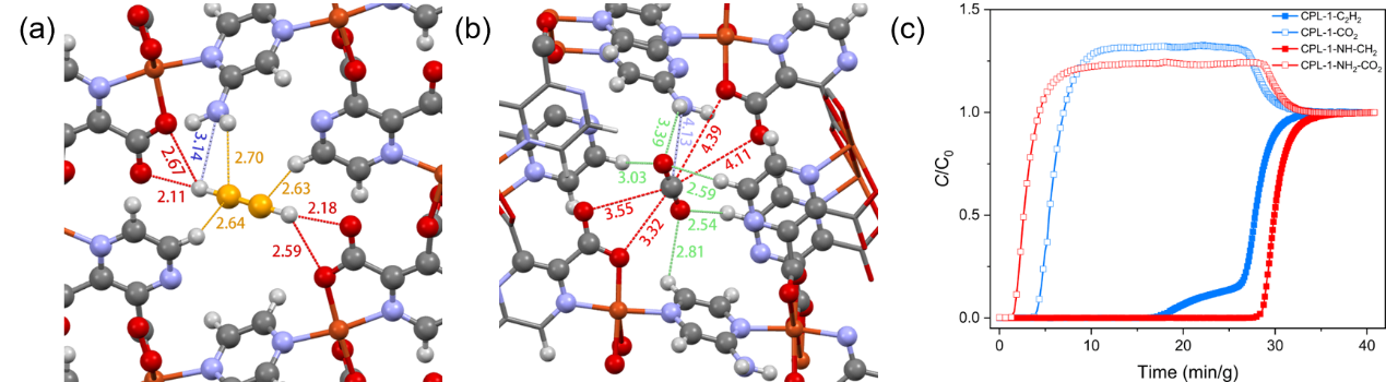赵学波教授科研团队根据乙炔和二氧化碳在孔道中排布方式和吸附位点的不同,以CPL-1为母体结构,发展了一种全新的吸附位点选择性占据方法实现了乙炔二氧化碳混合气的高效分离。在CPL-1中,C2H2分子主要以侧向(side-on)平行的方式吸附在孔道中,而CO2分子主要以端尾相对(end-on)的方式吸附在孔道中。由于每个晶胞可容纳两个CO2分子但仅可容纳一个C2H2分子,CPL-1对C2H2/CO2的分离效率较低。实验发现,将氨基(-NH2)修饰在CPL-1的孔道中之后,CPL-1-NH2孔道中的氨基成功占据了CO2的吸附空间和吸附位点,使CPL-1-NH2中的每个晶胞最多吸附一个CO2分子。出人意料地是,修饰的氨基降低了骨架与CO2分子的吸附结合能。与此相反,CPL-1-NH2对乙炔展现了更强的结合能力,在极低压力下即可吸附大量乙炔气体。因此,CPL-1-NH2展现了极高的C2H2/CO2分离效率,采用理想吸附溶液理论(IAST)模拟计算得到的常温常压条件下C2H2/CO2选择性为119,是文献中C2H2/CO2分离材料的佼佼者。