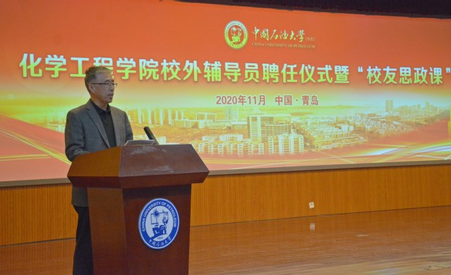 为了进一步凝聚育人合力,推动思政工作创新发展,11月8日,化学工程学院在逸夫礼堂举办校外辅导员聘任仪式暨“校友思政课”活动,聘任山东源根石油化工有限公司总工程师、加工82级校友袁俊洲,青岛惠城环保科技股份有限公司董事长、加工88级校友张新功,全国劳动模范、化工02级校友张磊,青岛石科化工技术有限公司总经理、应化10级校友满聪为校外辅导员。学校党委副书记万云波、党委学生工作部(处)部(处)长姚海田,学院院长杨朝合、党委书记李国、党委副书记王迅、院长助理陈小博出席仪式,班主任与学生代表参加活动。