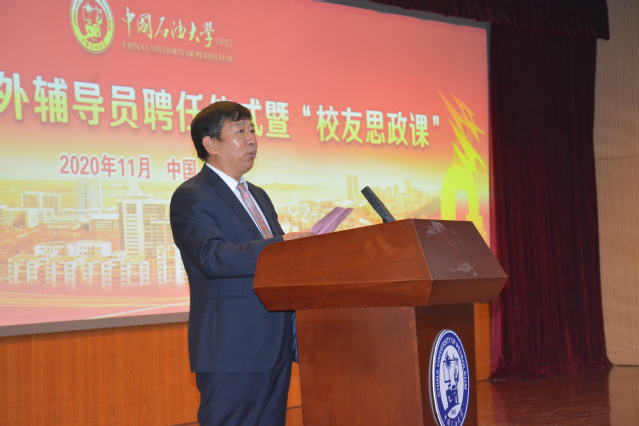 杨朝合发表讲话,他表示3位校友是学院67年来培养的两万多名毕业生中的杰出代表,是行业企业的骨干和自主创业的先锋,是石大学子励志成才的典型,也是化院人实业报国和追求卓越的榜样。他希望受聘校友把“社会课堂”与“思政课堂”结合,充分发挥知识优势和阅历优势,解决学生成长疑惑,树立正确的人生观和价值观;把“理论课堂”与“实践课堂”结合,努力把行业、企业最新的发展成果、最鲜活的实践案例带给学生,引导学生理论联系实际。对于学生,杨朝合提三点希望:一是人活精气神,将情感与情怀贯通,使个人成功的果实结在爱国主义这棵常青树上;二是做事先做人,将知识与见识贯通,在大学和社会这两所学校里练就真才实学;三是知行合一,将想法与办法贯通,在抓细、落小上下大功夫,把成才报国的理想转化为具体行动,为祖国建功立业,成就精彩人生。