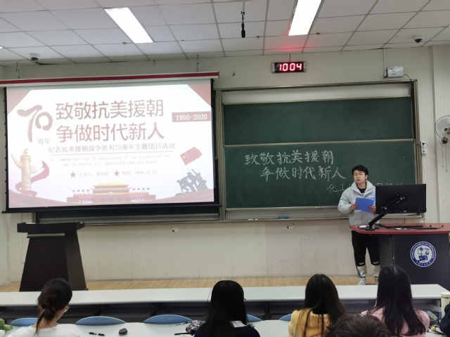 活动伊始,班长邵思程对本次团日活动的流程进行了简要说明,并通过观看视频资料的形式带领大家共同了解了抗美援朝战争的背景。接着,学生党员孙玉分享了革命先辈罗盛教的故事,帮助同学们更好地认识和了解抗美援朝中涌现出的英雄人物。同学们还集体观看《我的抗美援朝故事》,通过抗战老兵们的事迹分享,让同学们切身感受到革命前辈始终不渝的理想信念和视死如归的英雄气概。邢浩森和刘腾龙饱含深情地朗读《谁是最可爱的人》,表达出同学们对志愿军战士的热爱与崇敬,对牺牲烈士的祭奠与缅怀。最后,杨朝合对本次主题团日活动进行了总结。他结合国家发展情况和自身经历勉励同学们,要不忘初心、牢记使命,将来无论是继续学习深造还是走向社会,都要坚定理想信念,发扬“抗美援朝精神”,做一名爱党爱国爱人民、有理想、有本领、能担当的新时代新人。