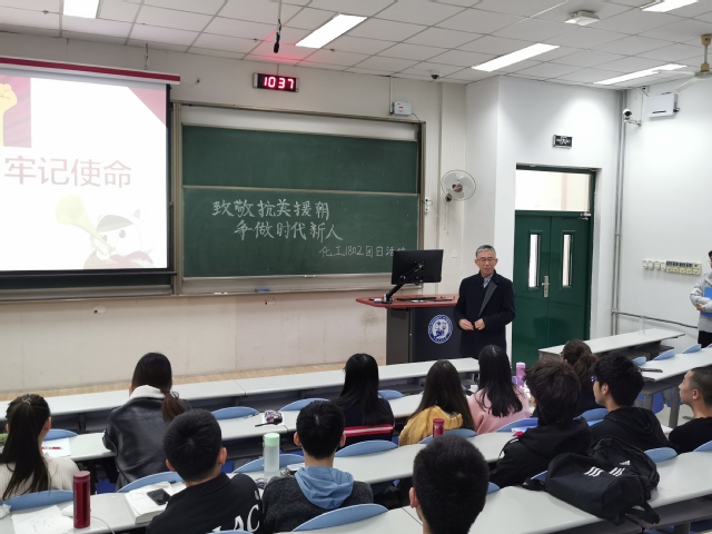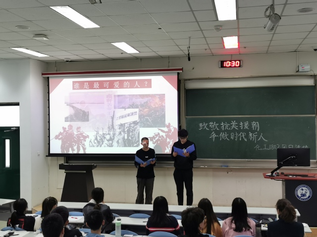 今年是中国人民志愿军抗美援朝出国作战70周年。为进一步弘扬伟大的抗美援朝精神,引领学生崇尚英雄、致敬英雄,增强学生爱国主义情怀,11月17日,化工1802班于东环107教室举办“致敬抗美援朝,争做时代新人”主题团日活动。院长杨朝合受邀出席,辅导员刘伟及化工1802班全体学生参加本次活动。