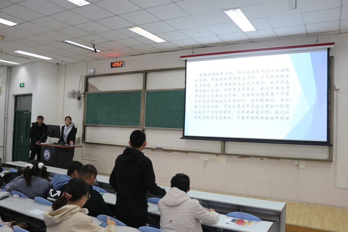 各班班长首先对前3个月的学习生活以及本班同学的高数成绩等情况进行总结,数学课代表向班内同学分析高数成绩不理想的原因,学习委员提出了日后的高数学习的整改措施。应化三班班长颜彩玉提出:“要实行分组自习的方式,让全班同学、特别是学习比较吃力的同学有固定的自习时间,通过组员的相互监督,保证自习的时间,提高自习的效率”。同时,她建议利用每周五的空余时间组织集体研讨,对平时上课不懂的问题进行讨论,帮助成绩不理想的同学提高。