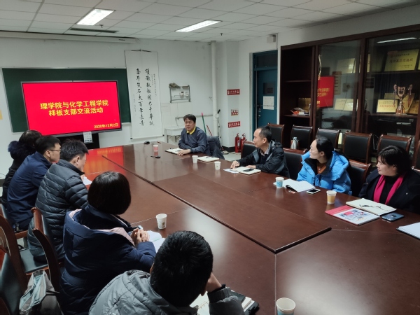 12月2日,理学院党委书记孙绪柱带领应用物理系党支部书记及成员一行5人到我院交流样板党支部建设工作。学院党委书记李国,化学工程系党支部书记孙昱东、原书记丁传芹等相关老师参加座谈交流。