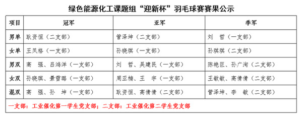 为贯彻落实党的十九届五中全会精神,积极响应以习近平同志为核心的党中央关于全民健身的号召,提升研究生身体素质,培养研究生积极参与体育锻炼的兴趣,工业催化第一学生党支部于10月30日筹办了绿色能源化工课题组“迎新杯”羽毛球赛,11月8日决赛。此次比赛耗时4天,共计60余人参赛。