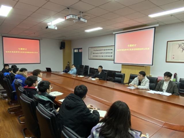 12月11日,学院于工科A121会议室组织学生党支部书记就“如何保证发展党员质量,有效发挥党员先锋模范带头作用”开展了专题研讨,研讨会由学生党总支副书记刘伟主持,辅导员及全体学生党支部书记参加。