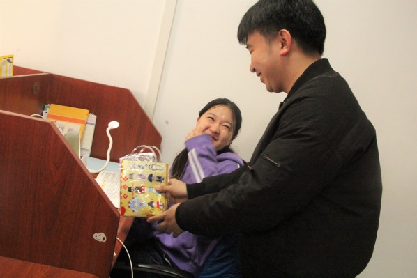 活动前期,由辅导员姜菲挑选采购温暖小礼包,其中包括暖水袋、小零食、写满鼓励话语的贺卡、寓意心想事成的橙子等,这些礼品均由山东广浦生物科技有限公司赞助。在礼品分发过程中,窦雅琴问候了学生们的学习情况,关注学生们的身体健康,同时还询问了学生考研自习室暖气供应是否正常,光线是否合适等问题。窦雅琴对考研学生说道:“希望你们调整好自己的心态,坚定信心,以最好的心态迎接考试,预祝你们金榜题名,考研成功!”