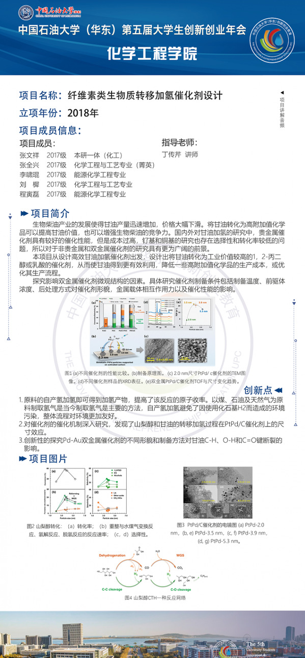 2月5日—14日,学校举办了第五届大学生创新创业年会,本届年会以“智汇青春·开创未来”为主题,经网络投票、学生答辩、专家评审、学校审定等环节,由杜峰副教授指导、2017级学生赵思名负责的“纤维素类生物质C-O键选择性氧化的纳米催化剂设计”项目及由丁传芹老师指导、2017级学生张文祥负责的“纤维素类生物质转移加氢催化剂设计”项目获评“优秀论文”(全校共10项)。由柴永明教授指导、2017级学生陈天舒负责的“基于电解水制氢的原位优品加氢催化体系建构”项目获评“最喜爱的项目”(全校共10项)。