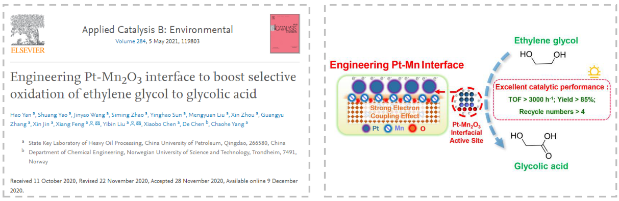 题为《Pt-Mn2O3界面工程促进乙二醇选择氧化制乙醇酸》(Engineering Pt-Mn2O3 interface to boost selective oxidation of ethylene glycol to glycolic acid)的论文发表在Applied Catalysis B: Environmental上。我院师资博士后闫昊为第一作者,刘熠斌副教授和冯翔教授为论文通讯作者。