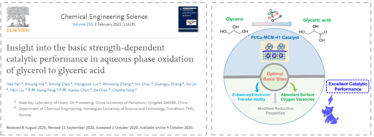 题为《深入了解甘油液相氧化制甘油酸体系中碱强度对催化性能的影响》(Insight into the Basic Strength-dependent Catalytic Performance in Aqueous Phase Oxidation of Glycerol to Glyceric acid)的论文发表在Chemical Engineering Science上。我院师资博士后闫昊为第一作者,刘熠斌副教授和冯翔教授为论文通讯作者。