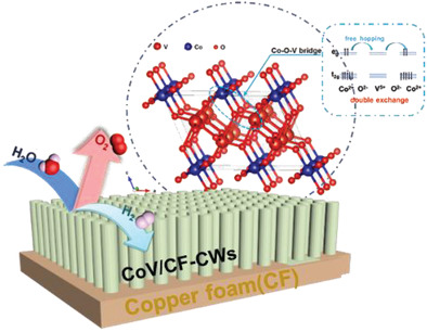 氢气具有能量密度大、使用过程无污染、无温室气体排放等优点,是推动能源技术革命的重要能源载体。电解水制氢技术是氢循环的关键环节,但常见电催化剂缓慢的载流子传输过程使得电解水制氢的效率低,难以满足应用需求。有鉴于此,团队提出在廉价CoO电催化剂中引入Co-V-O桥键,通过自旋翻转跳跃过程减小电荷传输能垒,提升电催化分解水性能,如图2所示。这种含有Co-V-O桥键的催化剂可生长在不同导电基底上,使得这类催化剂具有极高的实用价值。
