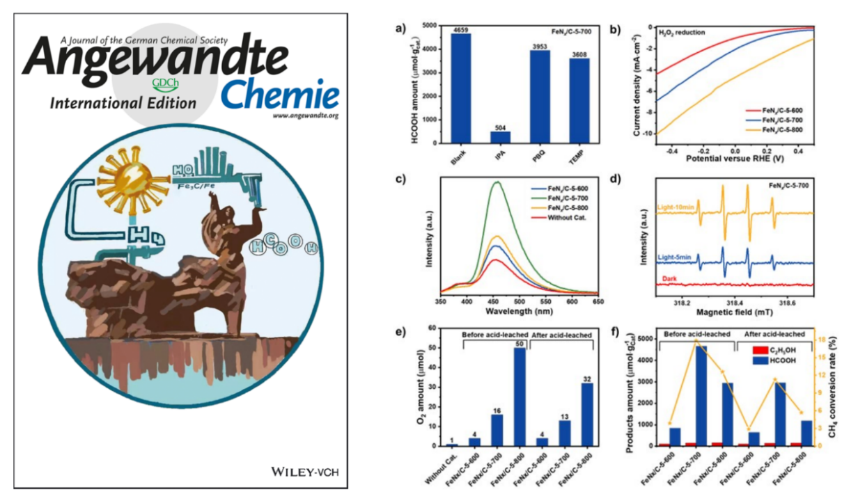 题为《Fe/Fe3C提升H2O2利用,实现甲烷转化抑制 O2生成》(Fe/Fe3C Boosts H2O2 Utilization for Methane Conversion Overwhelming O2 Generation)的成果发表在化学领域顶级期刊Angewandte Chemie International Edition上,并被选为封面文章,2018级硕士研究生邢毅成为第一作者,吴文婷教授和吴明铂教授为共同通讯作者。