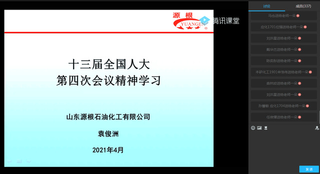 为深入学习贯彻习近平总书记在全国两会期间的重要讲话精神,4月1日,化学工程学院举办两会精神线上学习会,全国人大代表、山东源根石油化工有限公司总工程师、加工82级校友、校外辅导员袁俊洲受邀为学生解读两会精神,与300余名学生分享参加两会的感受,引导学生体会全国两会的重要意义、精神实质和丰富成果。