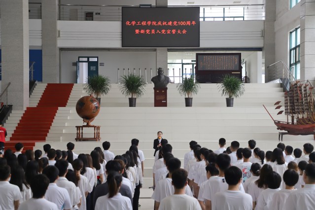 7月1日,在庆祝中国共产党成立100周年之际,化学工程学院在工科楼A座大厅举行新党员入党宣誓大会,共同回顾党的光辉历程和伟大成就,以新党员入党宣誓、老党员重温入党誓词的形式,进一步坚定理想信念,牢记初心使命,引领师生顽强拼搏、不懈奋斗,以优异成绩向建党100周年献礼。学院党委书记李国、副书记王迅,全体教工党支部书记、辅导员、新发展党员以及正式党员代表参加大会。