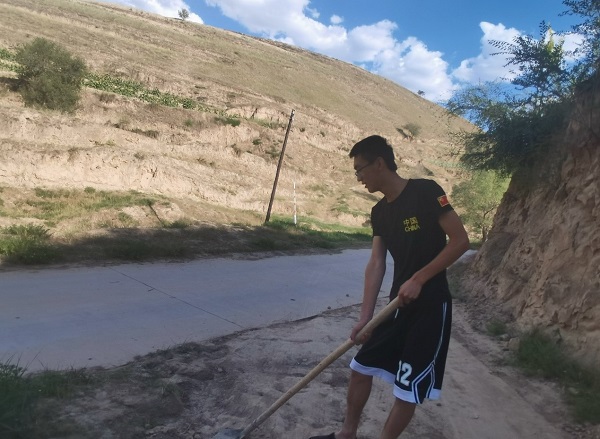 下午2时,王天禄个人实践队的队员拿着铁锹来到一天前被水冲毁的道路。看着这些被冲毁的路,联想到行人行走时较为危险,轿车通过时可能会陷在里面,王天禄就拿着铁锹先在不用的土堆上挖一些土,然后在陷下的路面填些小石块以保证路基的稳定,不至于再下雨时被水冲的更严重,然后再在小山渠里挖一些坚硬的土块,运上来混合在一起,因为旁边是水泥硬化路,这些土块依靠着硬化路,使得它们无缝衔接,将他们填结实起来。这条路不仅仅是行人与车通过,每天还有许多羊走过这条路,就不能在被修复的路面上放有草。王天禄就在小山渠里挖的土剔除了许多的杂草,然后就将这些杂草又运送到小山渠里的杂草堆里,将小山渠里的挖的土,那儿凹陷下去的地方用周围的土填平,防止下雨时被雨水冲成大坑,以防留下后患。最终从小山渠里上来在冲毁的路上继续填土与小石块。等填平之后又在上面踏成实心,用铁锹拍。这样的动作重复了两三次来回,直到不能将土再踏陷下去。