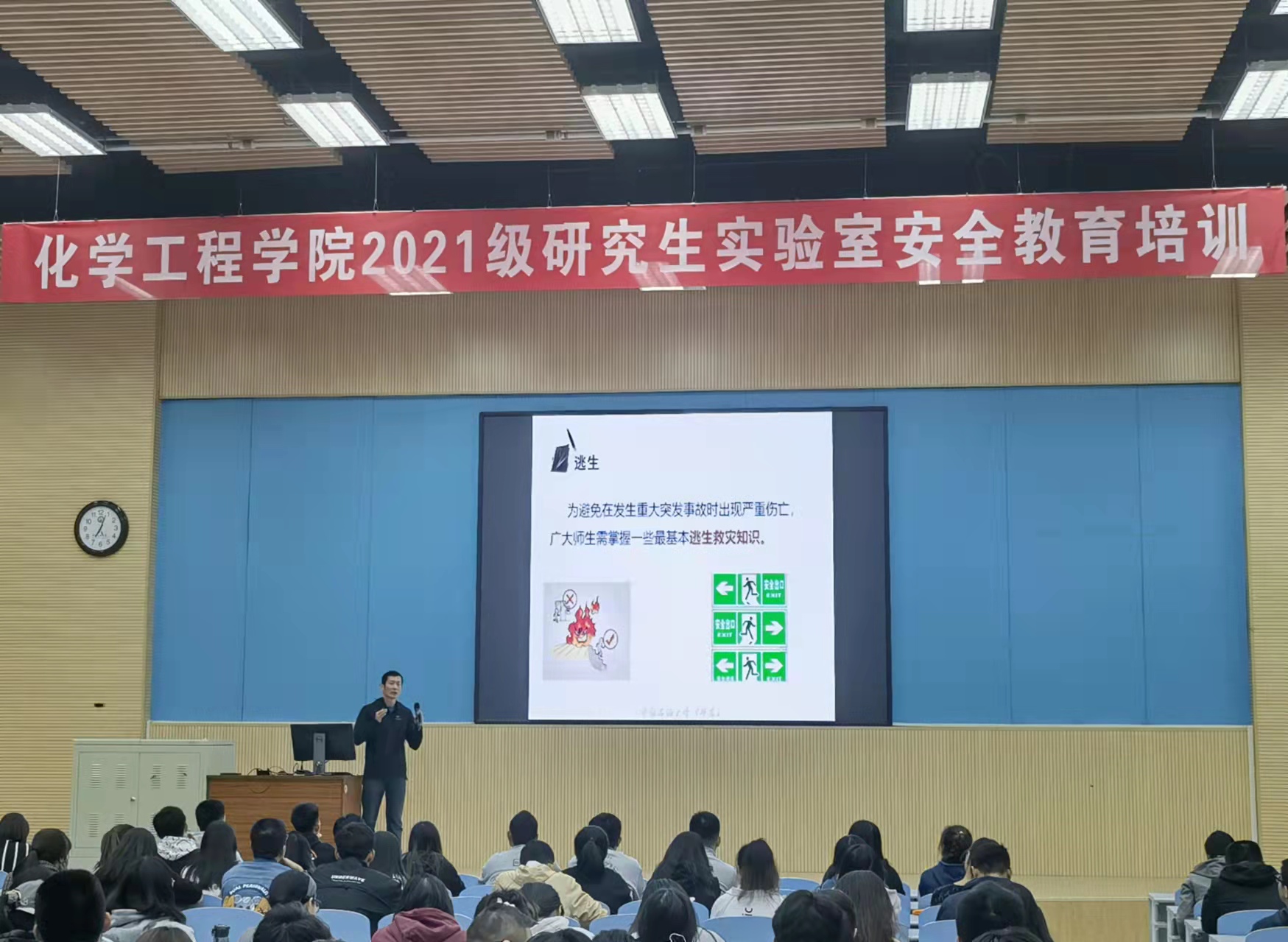 讲座伊始,路帅以所在教室的安全通道为例子,为同学们讲解了在进入实验室或日常生活场所时寻找安全通道的重要性,介绍了火灾类型、灭火器类型及紧急疏散时应注意的事项,要求同学们具有一定面对重大危险事故时的紧急逃生救灾知识。接下来,他以高校近几年所发生的重大实验室安全事故为警示案例,向同学们讲解了事故的发生原因,以及如何避免事故的发生。随后,路帅向同学们具体介绍了危险化学品、易制爆危险化学品、易制毒化学品等化学品术语及其相关知识,告诫同学们在使用化学品时要先了解化学品安全技术说明书。同时,路帅还向同学们介绍了实验室因违规操作导致的的一些其他事故,如触电、灼烫、冻伤和腐蚀等,告诫同学们在实验过程中应严格按照操作规程进行实验。最后,路帅具体讲解了进入实验室前、实验进行中、实验结束后应具体注意事项,以及防护用具的选择和气瓶的使用方法等。