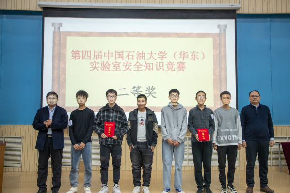 此次竞赛分为初赛和决赛两阶段。比赛初期,赛事组织者通过微信公众号、网站等多渠道发布电子海报、短视频吸引来自16个学院的超2000人次参加。百余支报名参赛队经过一周的准备,进行了激烈的初赛角逐,最终27位参赛选手组成的9支代表队进入决赛。决赛伊始,实验室管理处副处长成宏涛致开场辞,之后,各代表队登场介绍队名与参赛口号。在主持人宣布比赛规则之后,比赛正式开始。经过第一轮必答题与抢答题的角逐后,胜出的六支队伍进入第二阶段的风险题与必答题环节,最终经过激烈的角逐,来自2021级应化专业的第九队脱颖而出获得一等奖,由2020级化工专业学生组成的第一队、理学院2021级化学专业学生组成的第五队获得二等奖,由化工学院2021级研究生组成的第三、第七、第八队获得三等奖,第二、第四、第六队获得优秀奖。除此以外,比赛期间还设置观众互动环节,在场学生踊跃参与答题,赢取了丰厚的奖品。比赛结束后,到场嘉宾上台为获奖队伍颁发荣誉证书和奖品并合影留念。参赛选手应化2101滕国钊在赛后讲到:“本次竞赛的题目与实际操作紧密相关,对于提升大家的安全意识和安全应急处理能力有很大帮助,能有效降低实验中存在的安全隐患。”